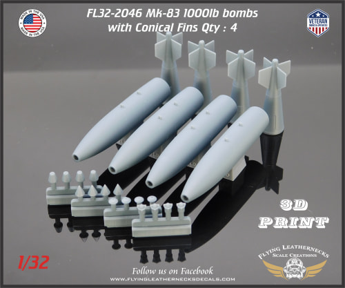 This set includes four (4) Mk-83 1000lb bombs, four (4) Conical fins and four (4) each of the following : M904 nose fuzes, Mk-43 TDD and MXU-735 Nose Plugs, Ogive Nose Plugs.